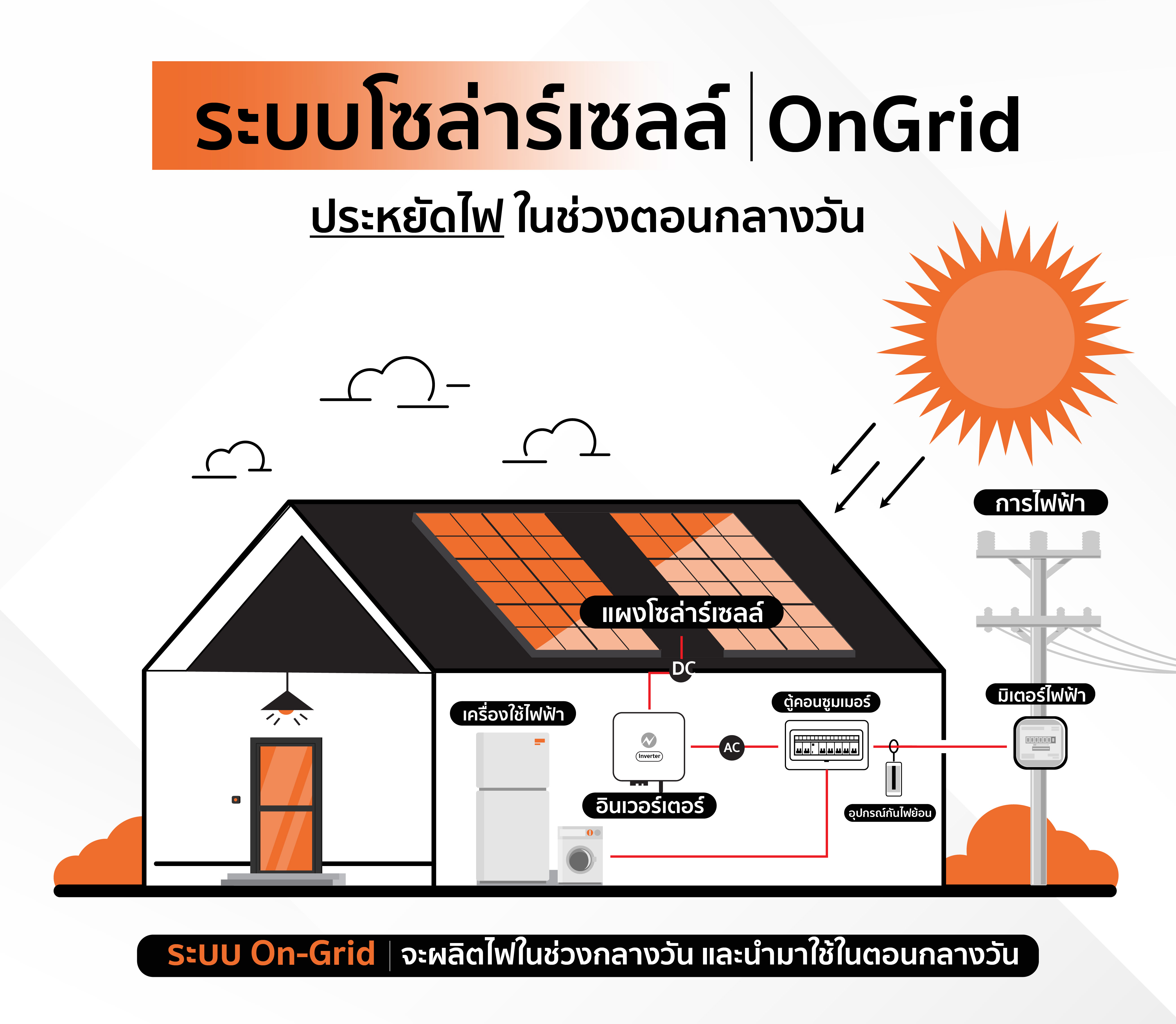 Set On Grid เป็นระบบโซลาร์เซลล์แบบต่อเข้ากับระบบสายส่งจากการไฟฟ้า (ไฟบ้าน) การผลิตไฟฟ้าระบบนี้จะใช้แผงโซลาร์เซลล์สำหรับการกำเนิดไฟฟ้าซึ่งจะแปลงไฟฟ้ากระแส (DC) ตรงเป็นไฟกระแสสลับ (AC) และจะต่อเข้ากับระบบไฟบ้าน เพื่อใช้งานร่วมกันต่อไประบบออนกริดเป็นอีกหนึ่งทางเลือกในการช่วยประหยัดพลังงานโดยใช้แผงโซล่าเซลล์ที่ใช้รับพลังงานความร้อนจากแสงอาทิตย์ซึ่งระบบนี้เหมาะกับการใช้งาน ในตอนกลางวันเท่านั้น